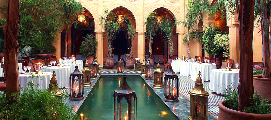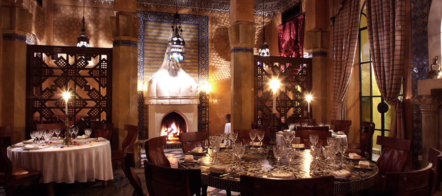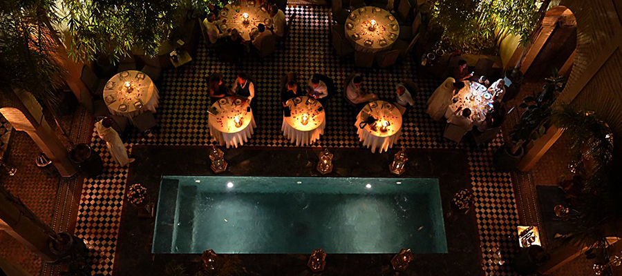 Offer yourself a good house cocktail on the panoramic roof-terraces and enjoy the exceptional charm of Marrakech by Night, before going down to have a seat in one of the different restaurant lounges and spaces, and start an almost unique evening of thousand and one nights under the rhythms of Gnawa or Duo-Andalusian music.